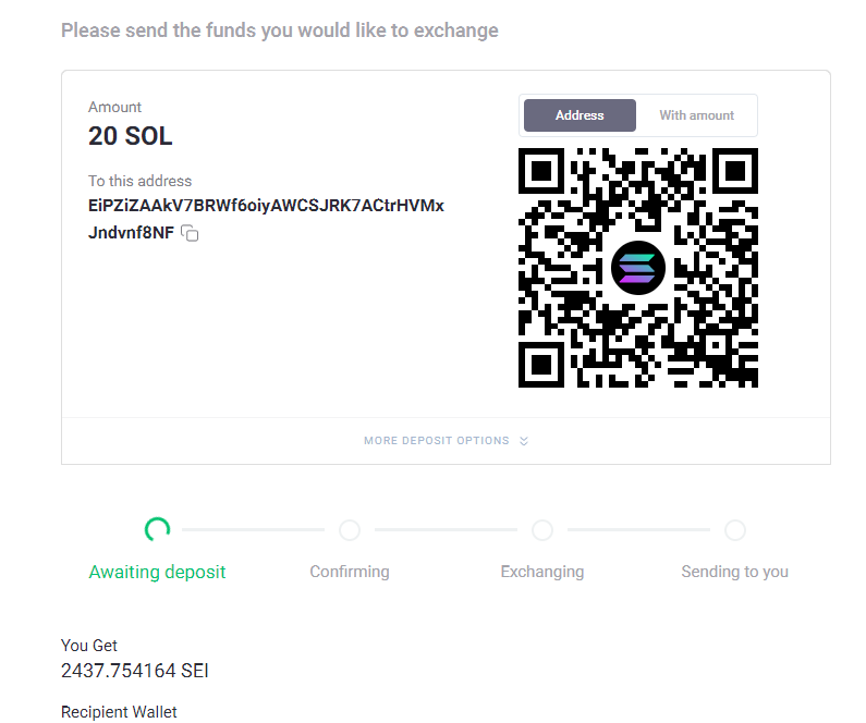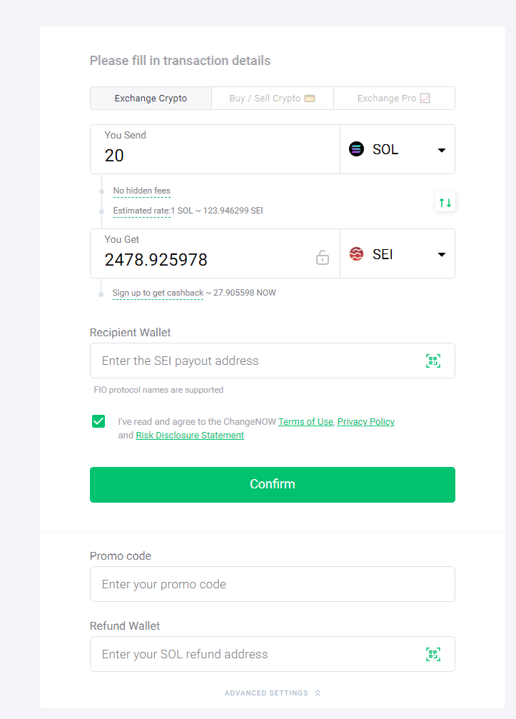 2. Enter your SEI Payout Wallet Address and Refund address in case exchange fails, they will return your Funds. (Like during volatile price movements)
